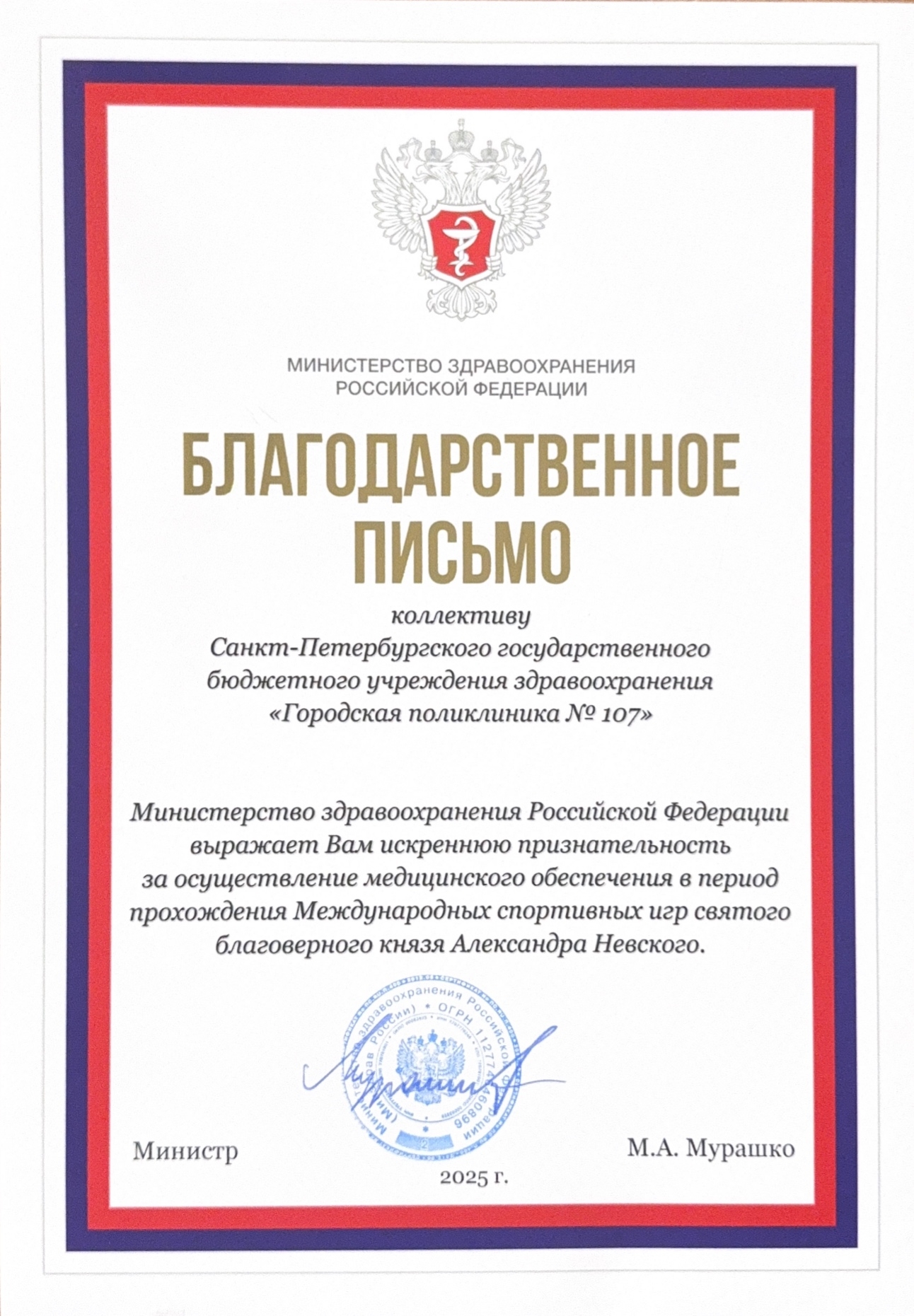 Коллектив Городской поликлиники №107 удостоен благодарственного письма Министерства здравоохранения РФ. В документе отмечена искренняя признательность за ответственное и качественное медицинское обеспечение во время проведения Международных спортивных игр святого благоверного князя Александра Невского.
